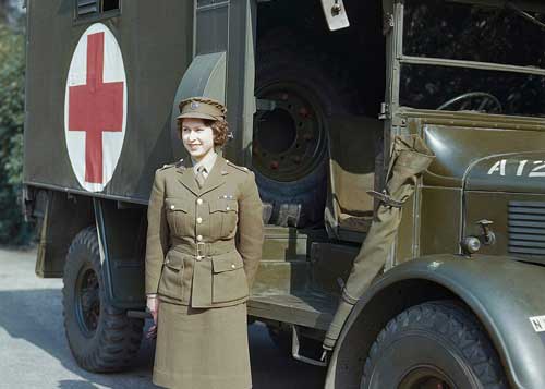 Princess Elizabeth, a 2nd Subaltern in the ATS standing in front of an ambulance.