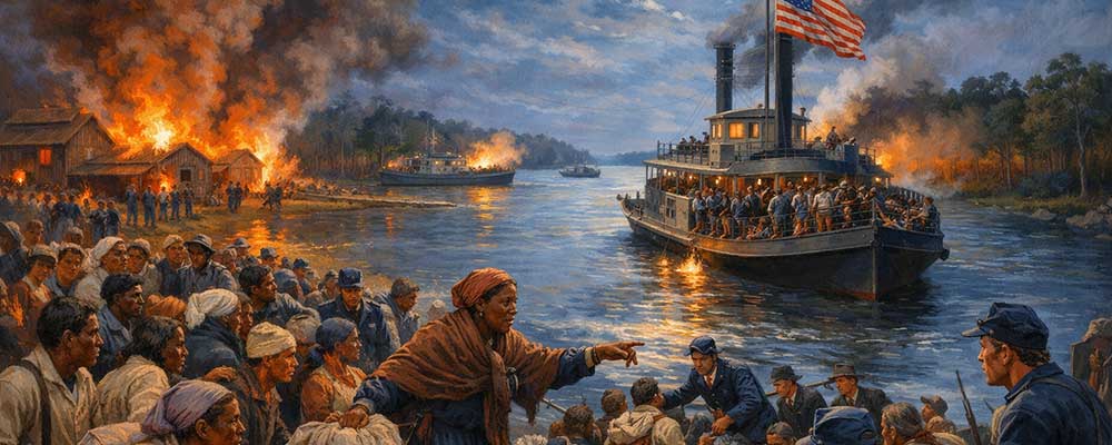 Enslaved families emerged from cabins and fields as the flames took hold and word spread. They appeared on the riverbank in groups with children and meager possessions, at once fearful and hopeful. “Never saw such a sight,” Tubman later said. Hundreds of people gathered around the landings, uncertain but willing.
