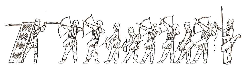 On the battlefield, Sparabara would usually be one of the first lines of engagement in battle. As the enemy approached, Persian archers behind the shield wall would open fire, harassing the opposing forces. If a fight broke up close enough, the shield-bearers would lay down their bows and fight with spears and shields in melee. Though the Sparabara were occasionally outnumbered or outmatched by heavily armored forces in defensive positions (particularly hoplites) in constricted terrain, their ability to hold off against enemy charges was one of their significant advantages on open battlefields.