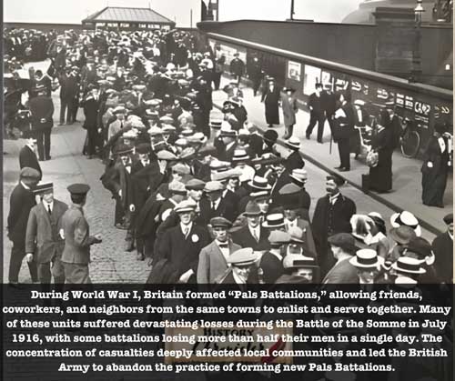 Pals battalions were created to help recruitment by allowing groups of friends, neighbors, and workmates to volunteer together for military service. This initiative greatly increased volunteering in the war’s earliest stages. The downside was that when a Pals battalion was heavily depleted by casualties, whole communities at home could be affected by the loss of their Pals. This cruel lesson played out dramatically during the early stages of the Battle of the Somme, which saw large numbers of Pals battalions suffering heavy casualties within the first few days of the campaign.