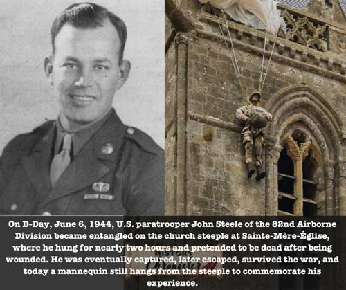 On June 6, 1944, U.S. paratrooper John Steele of the 82nd Airborne Division was caught in the church steeple of Sainte-Mère-Église while his parachute was still open during the D-Day invasion. Hanging for about an hour and a half with German troops firing at his location on the ground, Steele was shot and wounded, as he feigned being dead until being captured by Germans before escaping later to survive the war. His ordeal was portrayed in the classic film The Longest Day, and remains one of the most iconic images of D-Day.