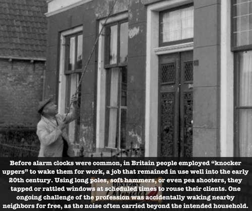 Before alarm clocks, British workers hired “knocker-uppers” to wake them for early jobs. Armed with long poles, soft hammers, or pea shooters, these human alarms tapped on windows at appointed times. The job had one big flaw, the racket often woke up nearby neighbors who hadn’t paid a penny.