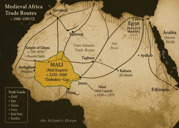 Mali was no longer just a rumor beyond the desert after Cairo. Mansa Musa’s journey made West Africa the subject of gossip at courts because it associated Mali with one thing outsiders knew: gold. Stories of Mali flooding markets with gold reached Europe on trade routes shared with pepper and cloth. Mali was visible in a way beyond geography; its reputation was real.