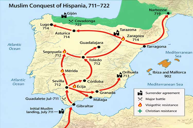The major turning point in the early conquest is commonly associated with the Battle of Guadalete or, rather, a series of engagements now recalled by that name. In 711, King Roderic (Don Rodrigo) confronted the invading army in a battle that decided much more than the fate of a single field. Accounts vary, but the result does not: Roderic’s forces were defeated, and his power disintegrated with them. In a realm already weakened by faction, one such disaster was enough to break the political center.